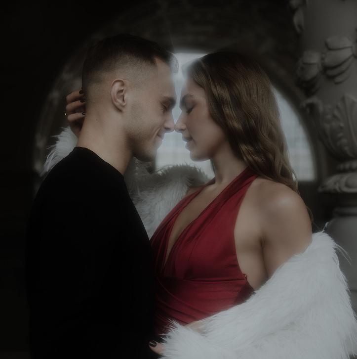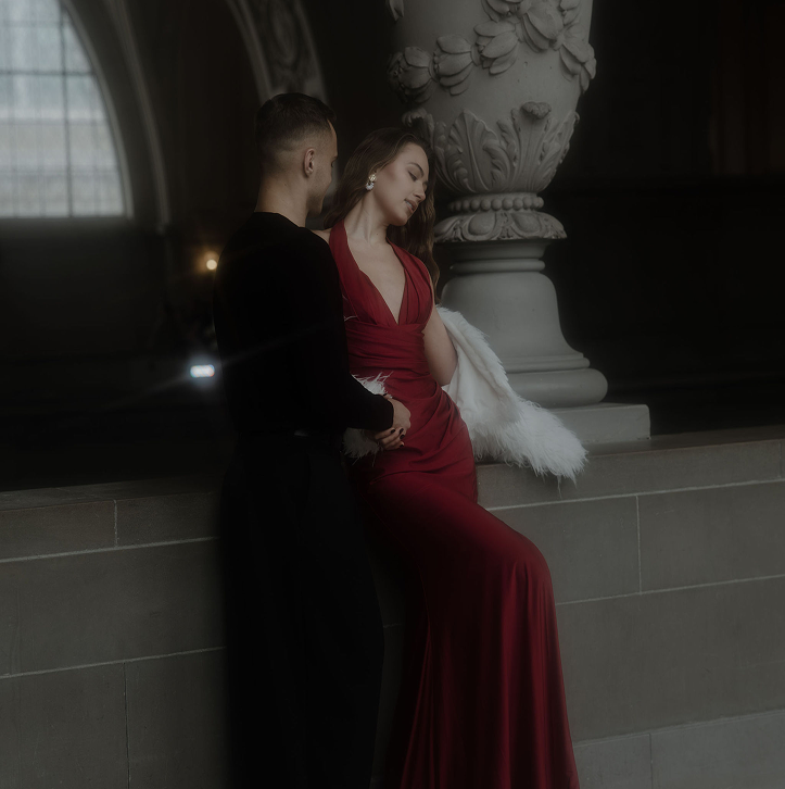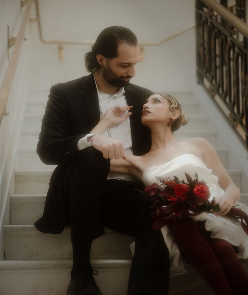 Grand staircases, historic windows, and dramatic shadows create a powerful stage.She is delicate yet commanding. He is grounded and composed. Moving through the space with quiet confidence, they embody modern love—refined, daring, and unmistakably powerful.Burgundy Love is not only about softness. It’s about presence.