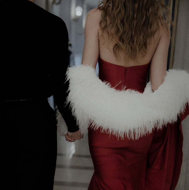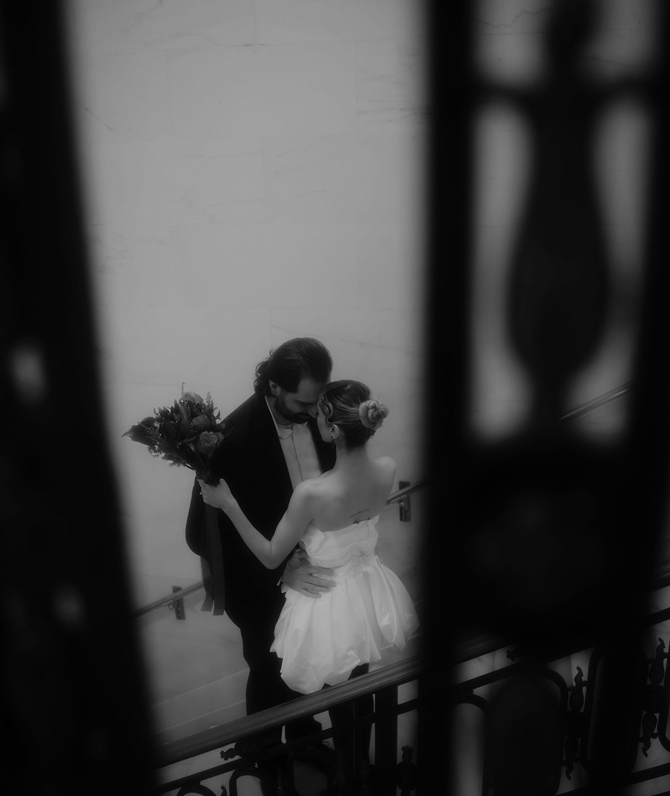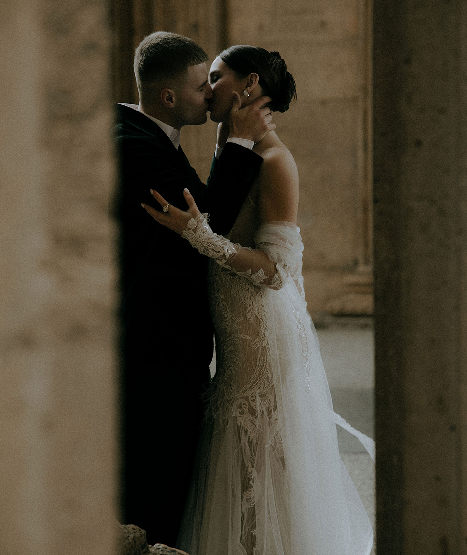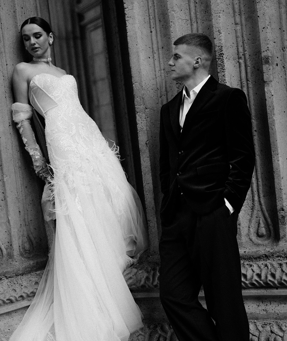 The bride moves through the space with controlled grace structured corsetry, sheer gloves, flowing silk, white florals that feel almost sculptural in their purity. The setting carries history. The styling carries refinement. He stands in tailored black grounded, composed. She remains luminous, almost untouchable. Together, they create contrast not through color, but through presence.The vastness of the colonnade emphasizes intimacy. The symmetry frames emotion. This story is not loud. It is timeless. A study of elegance placed inside architecture that feels eternal.