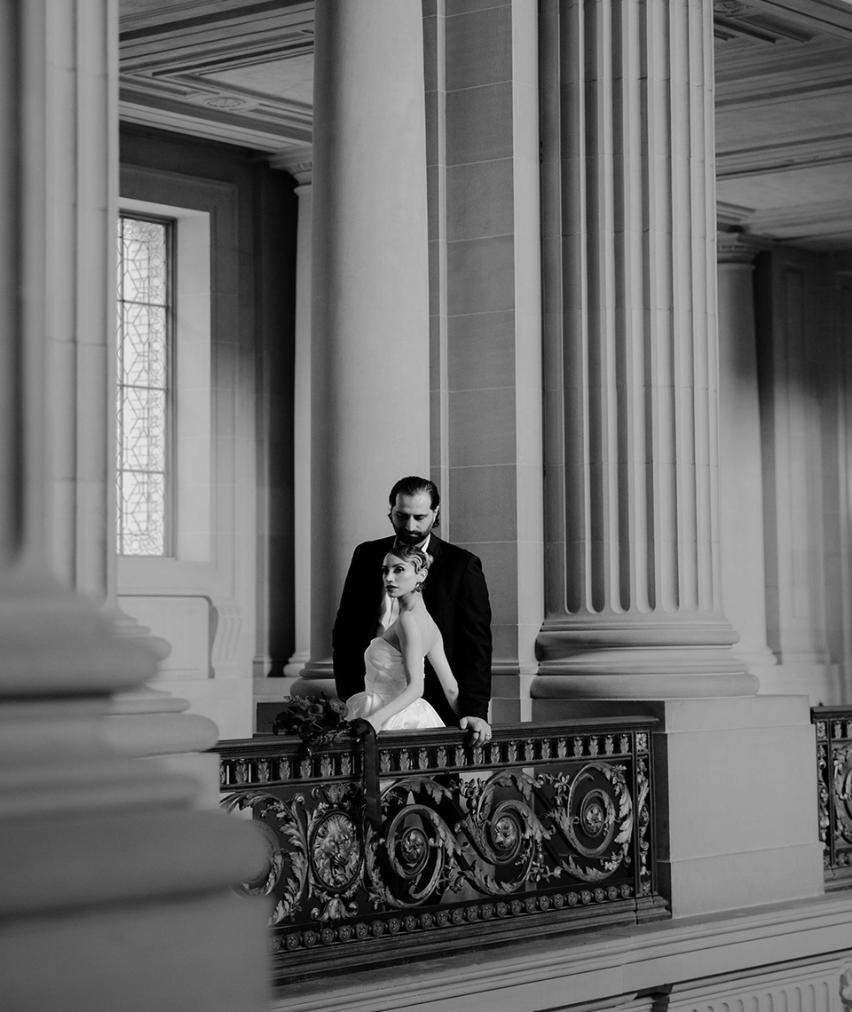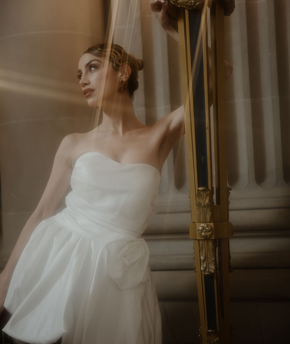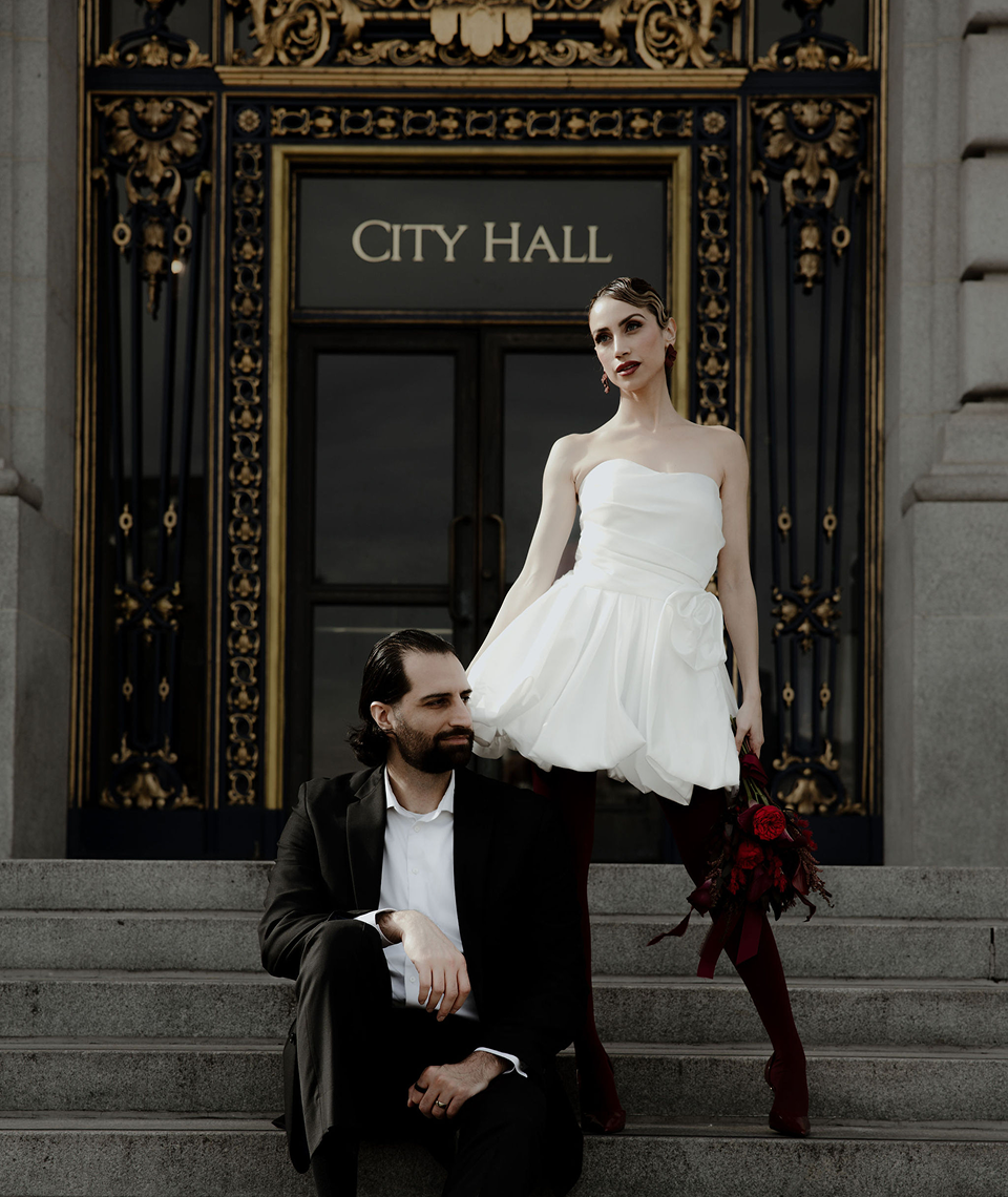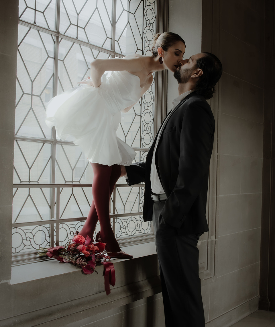 Burgundy Loveis a story of bold elegance set inside the timeless architecture of San Francisco City Hall. This editorial explores contrast softness within structure, romance framed by marble and gold.The bridal look redefines tradition: a sculptural white mini dress paired with unexpected burgundy tights and deep red florals as a statement.