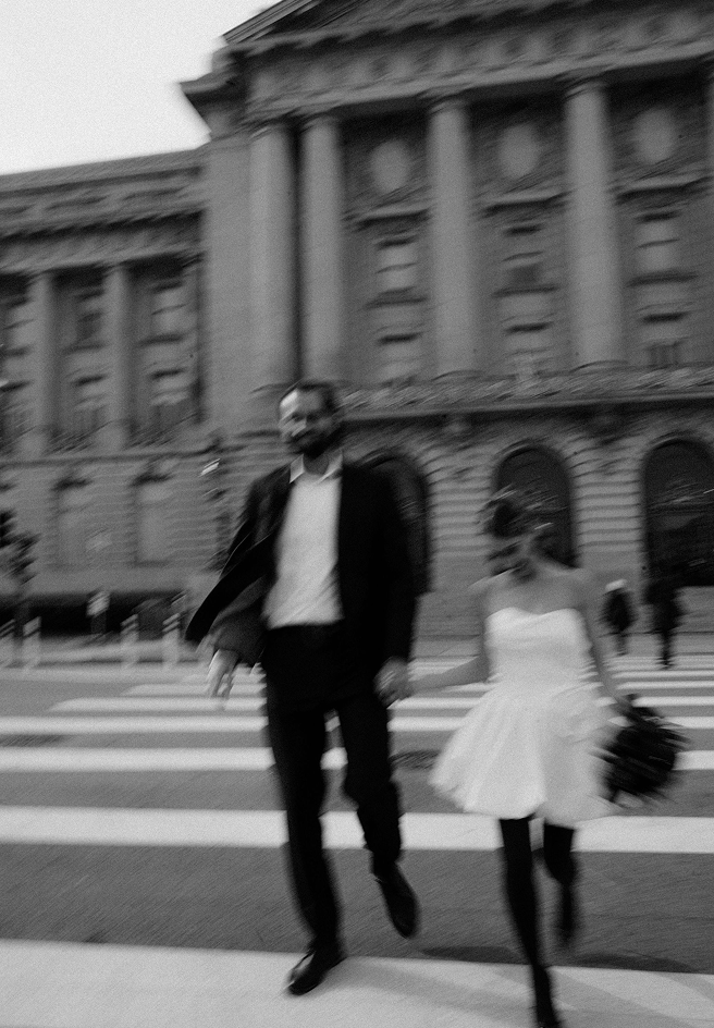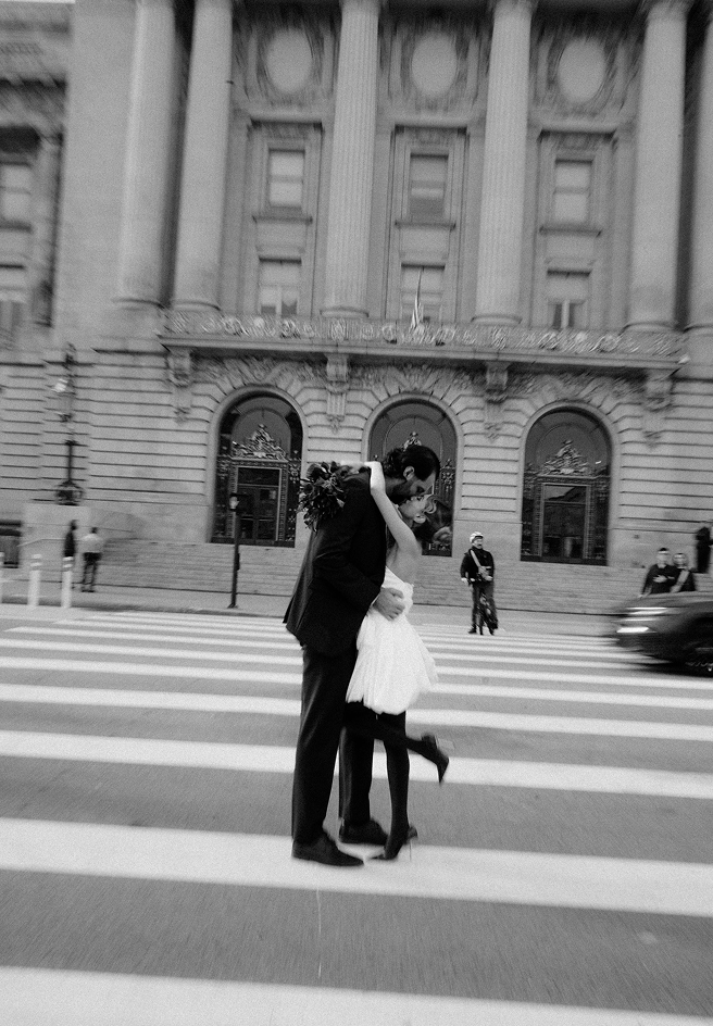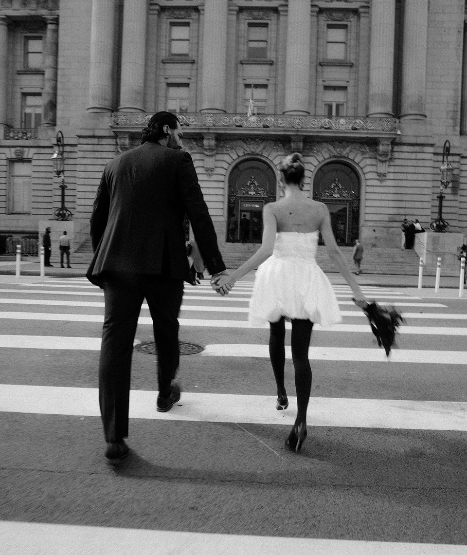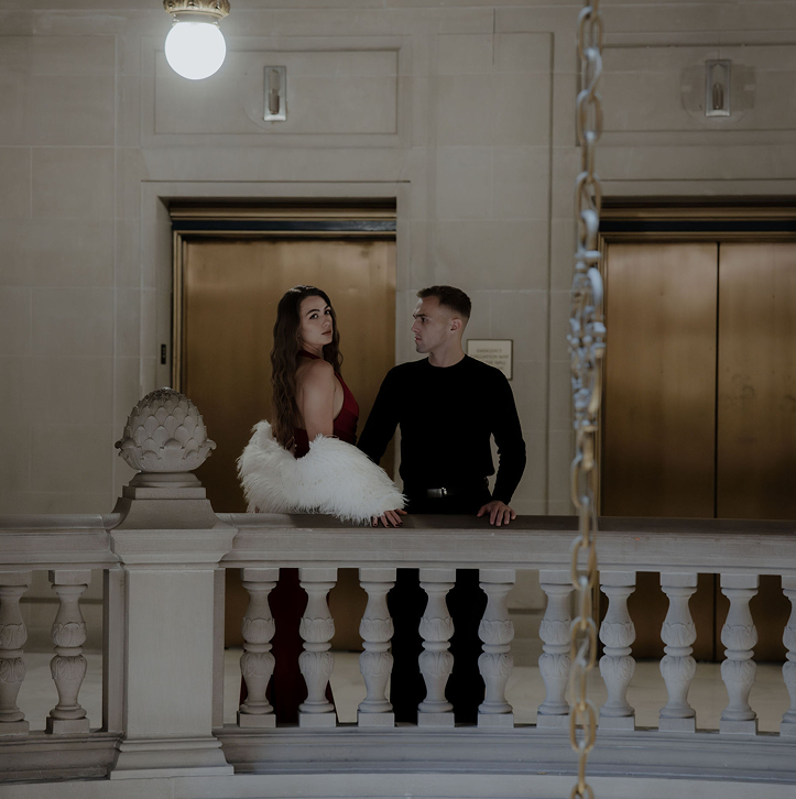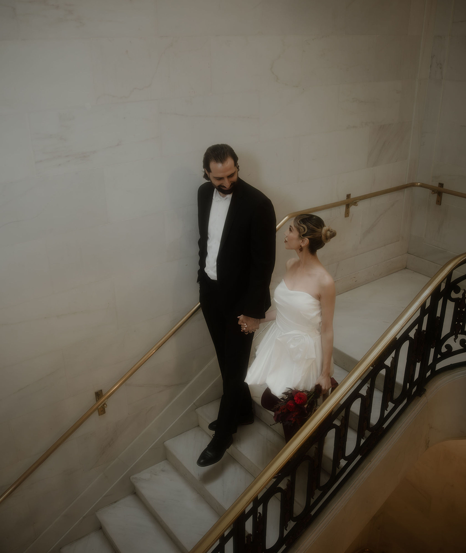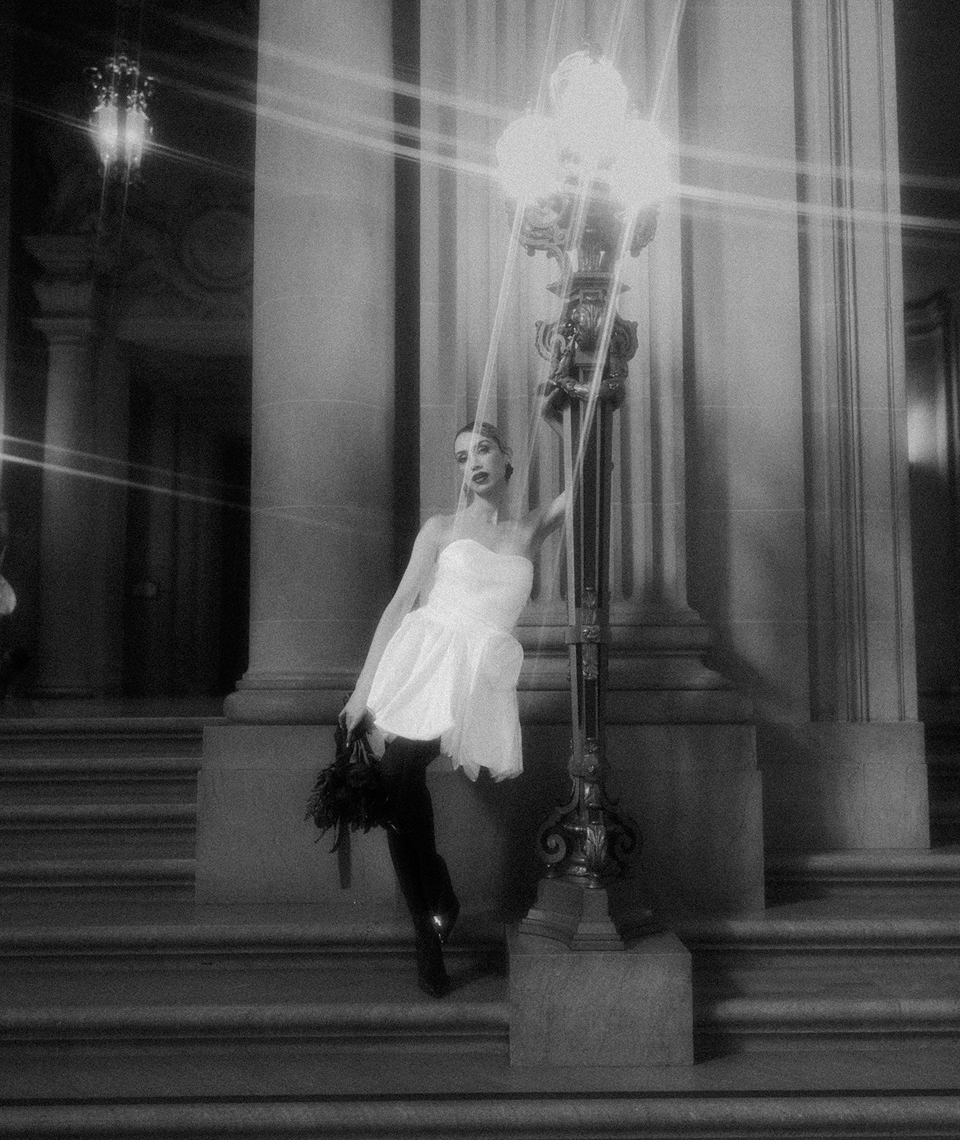 Burgundy Loveis a story of bold elegance set inside the timeless architecture of San Francisco City Hall. This editorial explores contrast softness within structure, romance framed by marble and gold.The bridal look redefines tradition: a sculptural white mini dress paired with unexpected burgundy tights and deep red florals as a statement.