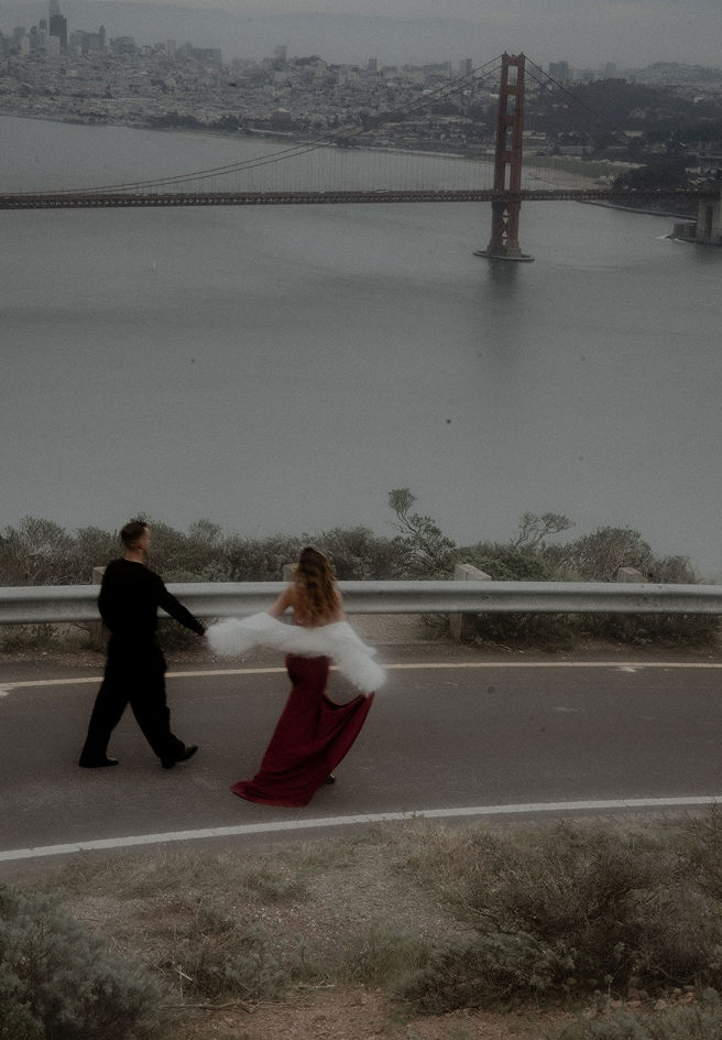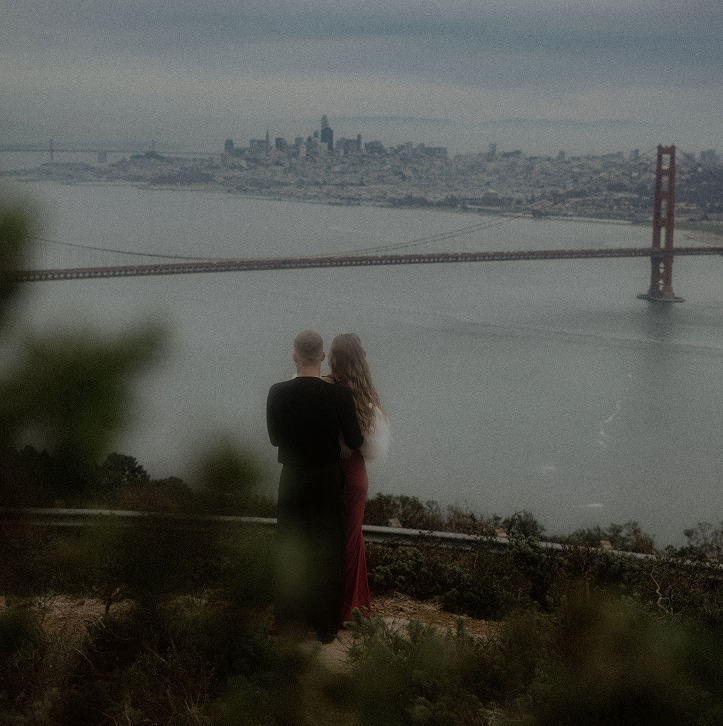 Golden Gate Bridge, San FranciscoConcept: Passionate love set against a cinematic San Francisco skyline.Location: Golden Gate Bridge overlookMood: Moody, wind-driven, dramatic, fashion-forward.High above the bay, where the city fades into mist, this love story unfolds in silence and wind. The Golden Gate Bridge stands distant monumental, untouchable. They stand closer. Muted skies.