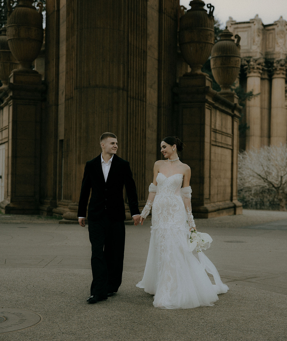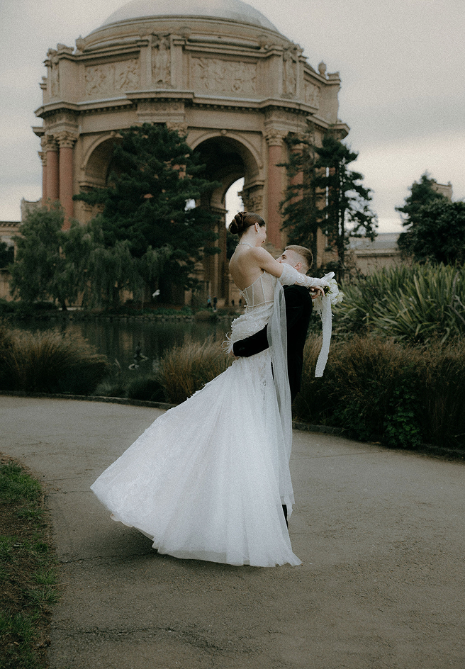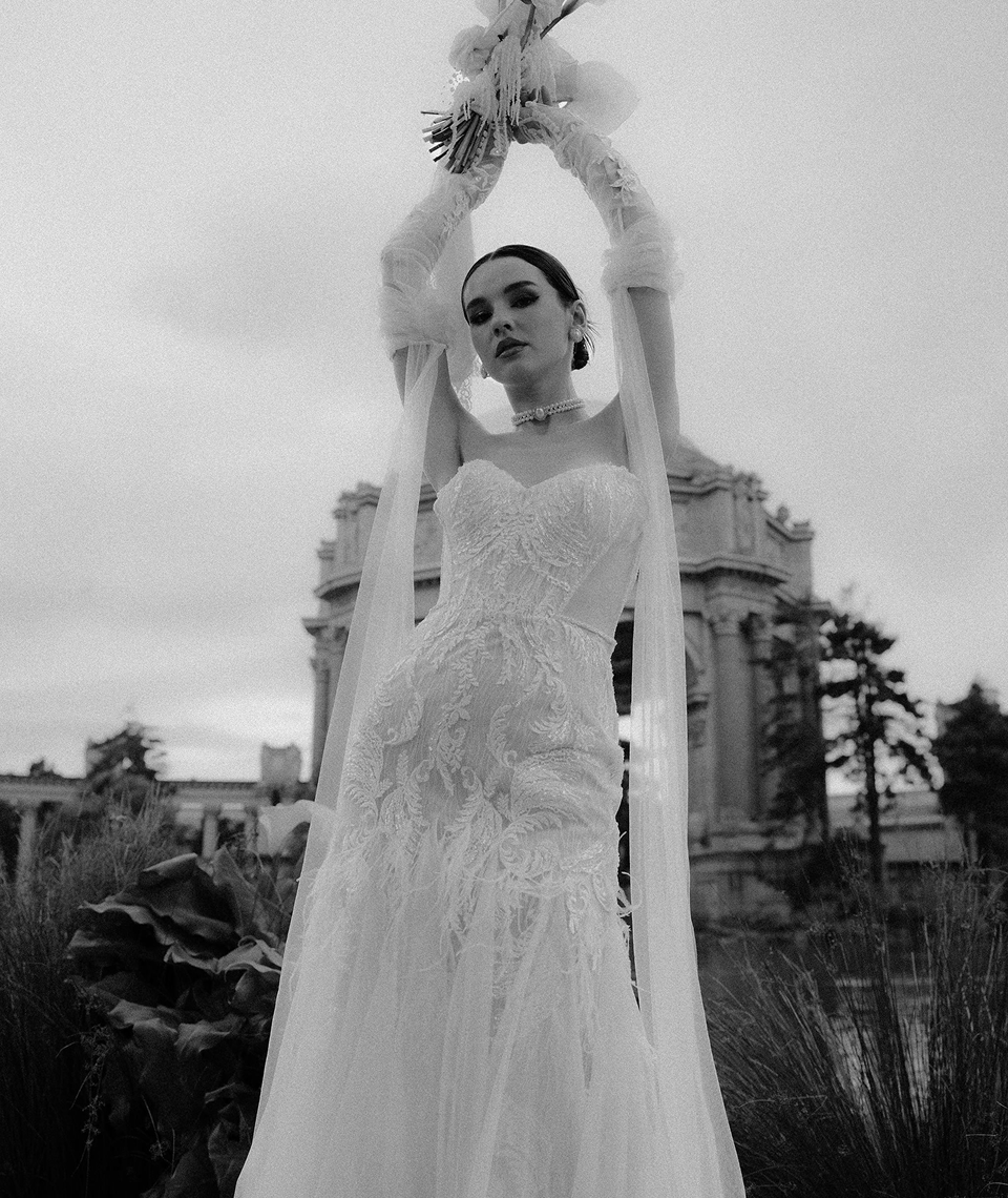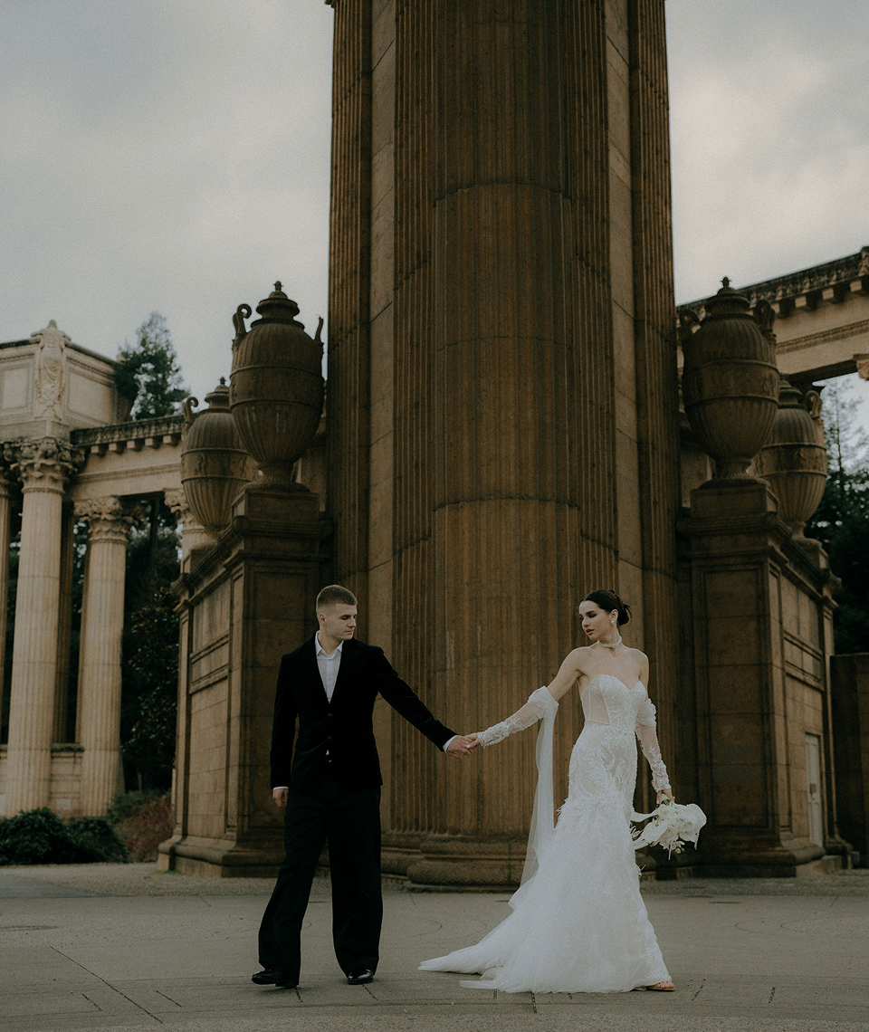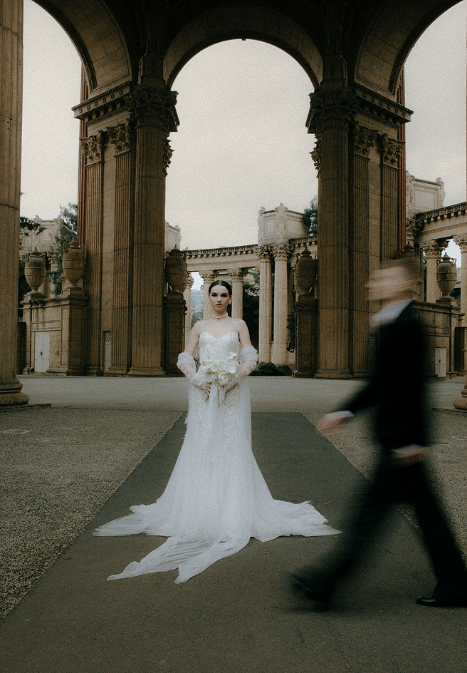 Concept: Timeless bridal elegance framed by monumental architecture.Location: Palace of Fine Arts, San FranciscoVisual language: Sculptural lace, monochrome palette, architectural symmetry, cinematic stillness.Beneath the monumental columns of the Palace of Fine Arts,this editorial unfolds like a quiet cinematic poem. Ancient architecture. Still water reflecting soft skies. Marble tones against delicate lace.