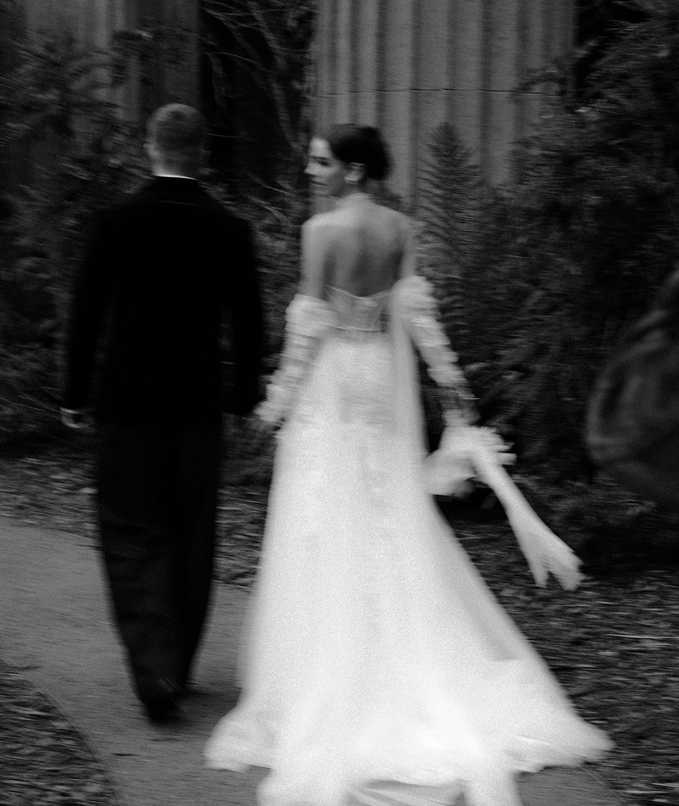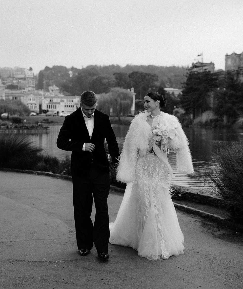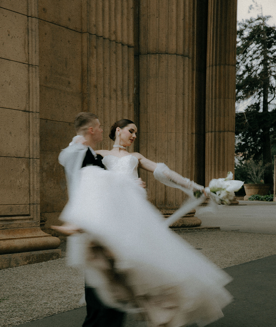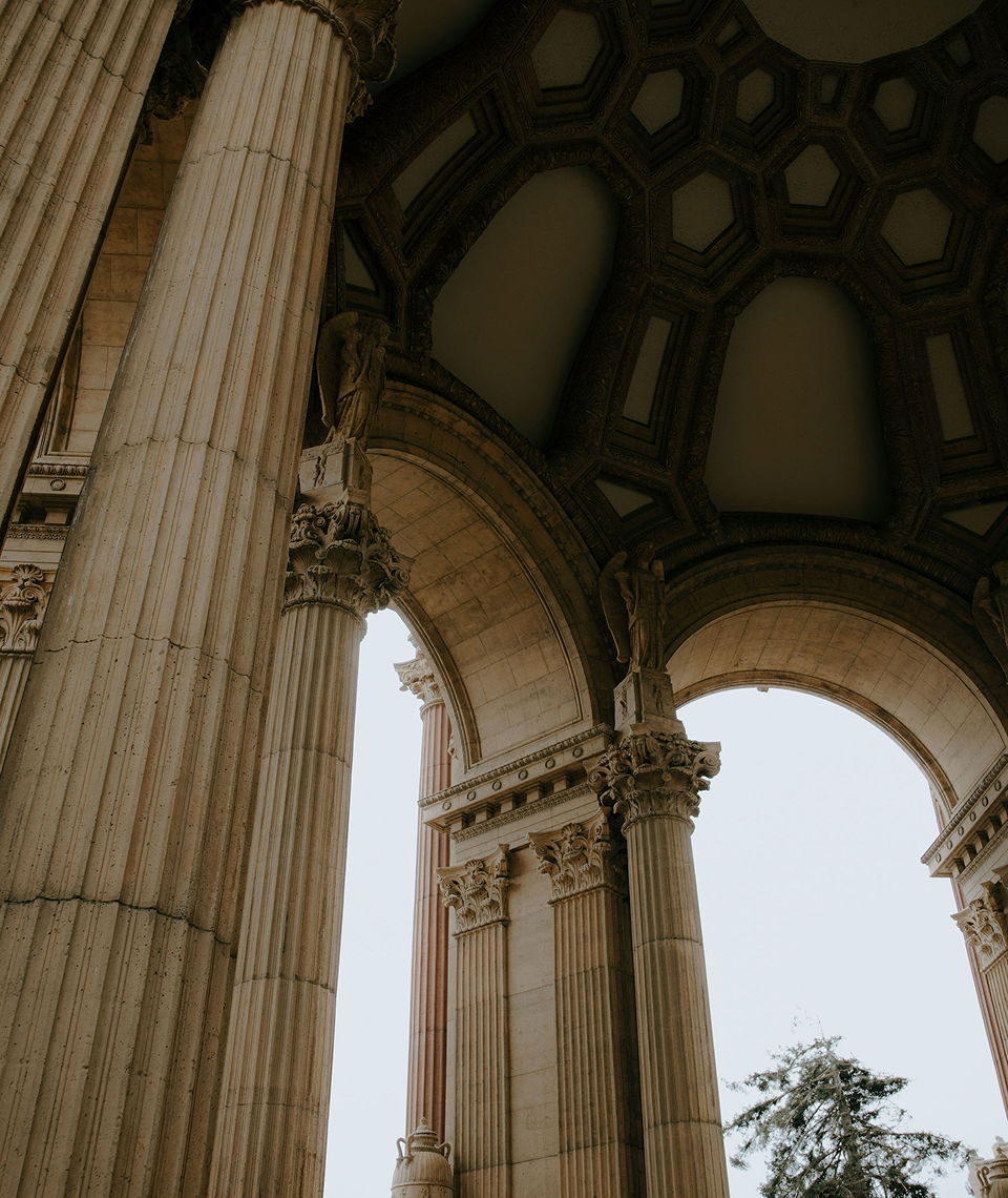 Concept: Timeless bridal elegance framed by monumental architecture.Location: Palace of Fine Arts, San FranciscoVisual language: Sculptural lace, monochrome palette, architectural symmetry, cinematic stillness.Beneath the monumental columns of the Palace of Fine Arts,this editorial unfolds like a quiet cinematic poem. Ancient architecture. Still water reflecting soft skies. Marble tones against delicate lace.