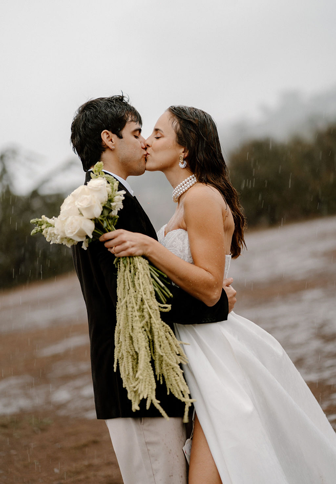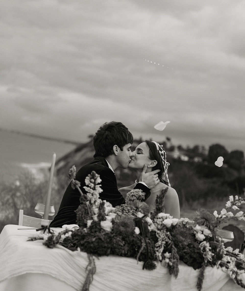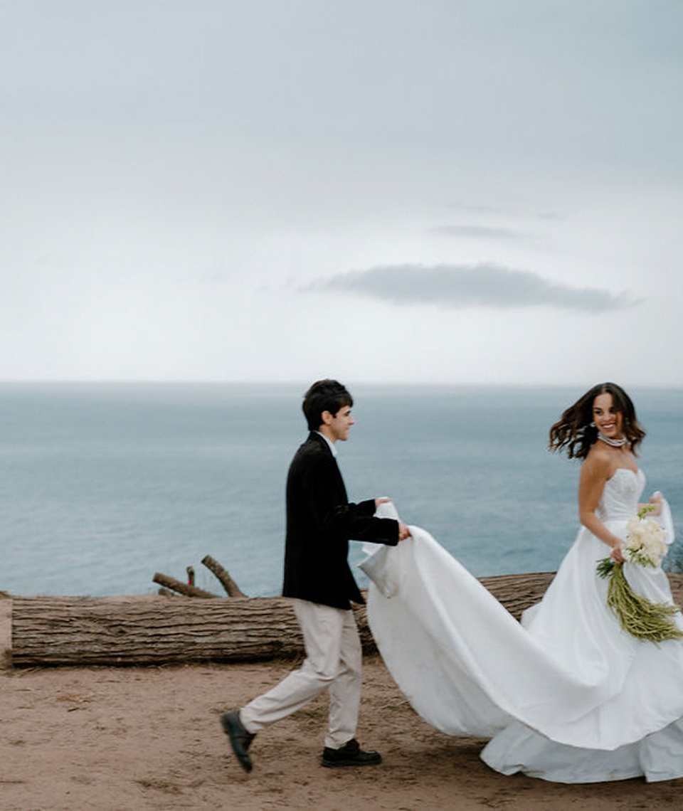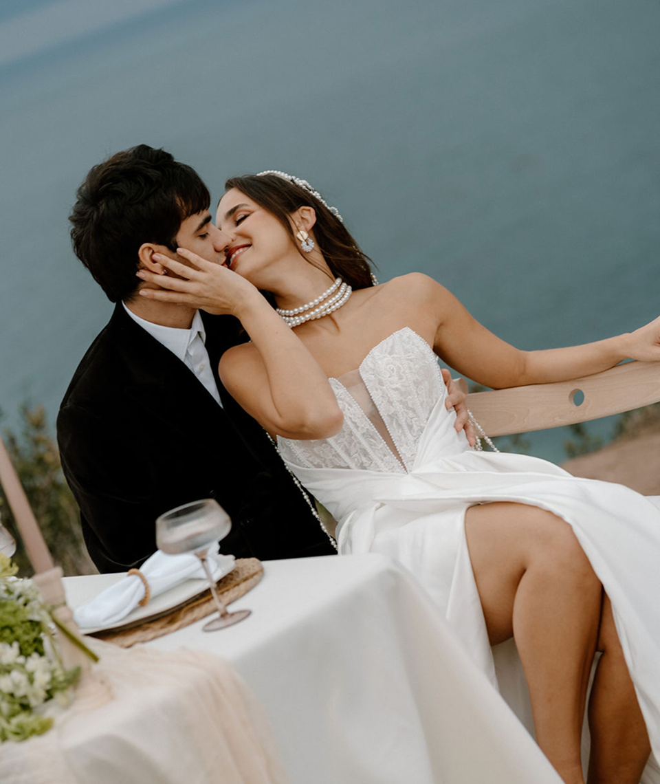 This part of the story was purely editorial. A minimal table set on the edge of the cliff. Soft florals in muted greens and ivory. Pearls, silk textures, candlelight against the ocean horizon. The concept was simple intimacy, elegance, and raw coastal beauty.Then the weather shifted. A sudden, heavy rain began. Instead of stopping, we continued. The rain didn’t ruin the moment it transformed it. Wet hair. Wind in the veil. Drops on the groom’s jacket. Movement that felt real and alive. What started as a styled shoot became cinematic.The rain added depth, emotion, atmosphere a reminder that not everything beautiful needs perfect weather.